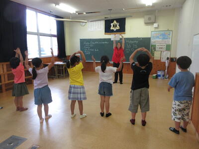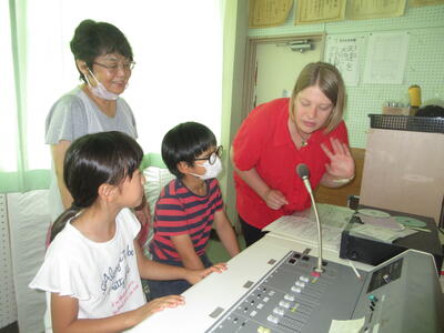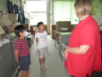 お昼の放送では、コリーン先生や小坂先生と子どもたちが英語会話を放送しています。