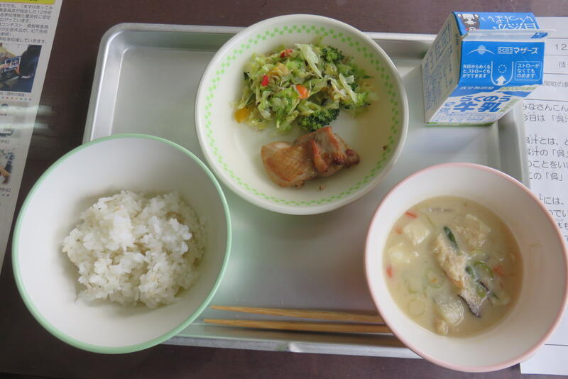 今日のみそ汁は、さつまいものみそ汁です。本校の1,2年生も、先週、サツマイモ掘りをして楽しんでいました。今が旬のおいしい食材ですね。