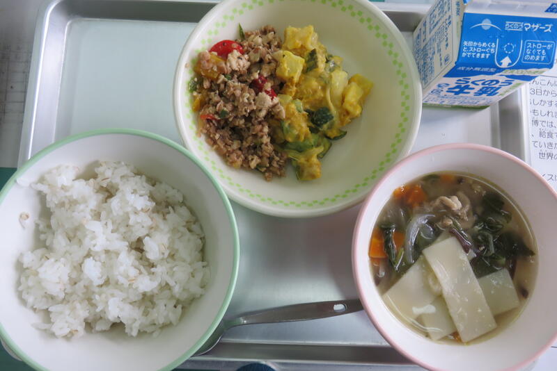 今日のみそ汁は、さつまいものみそ汁です。本校の1,2年生も、先週、サツマイモ掘りをして楽しんでいました。今が旬のおいしい食材ですね。