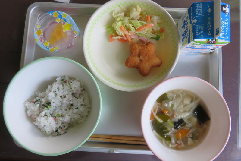 今日の給食の献立は、「五色ごはん、きつねうどん汁、かきあげ、しそひじきあえ、牛乳」です。