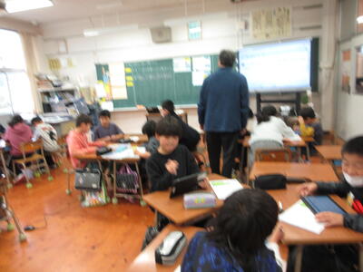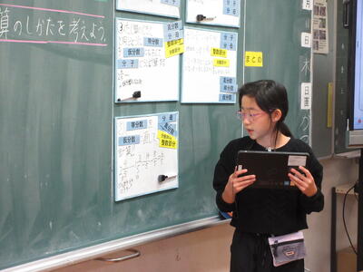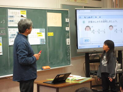4年生算数科授業の様子です。分数の計算を勉強しています。南関町教育委員会の寺田指導主事に指導をいただきながら授業改善を進めています。