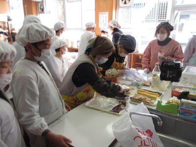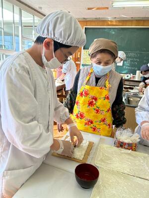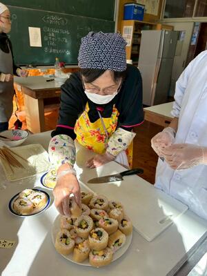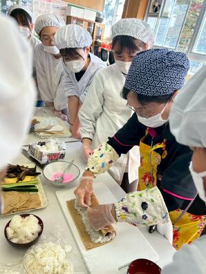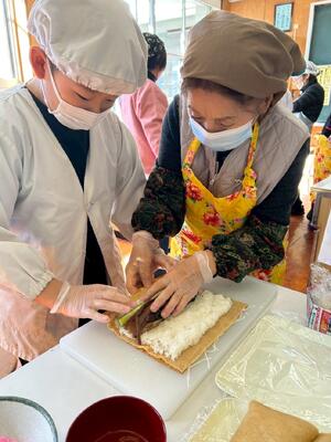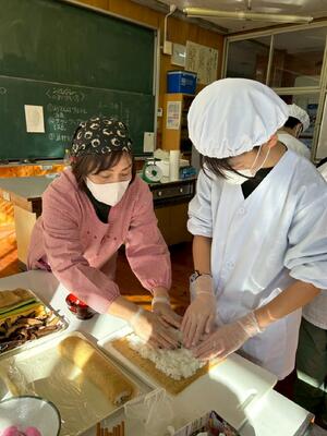 12月12日(金)、6年生が郷土学習「大好き!南関町」の一環として南関あげ巻き寿司づくりに取り組みました。婦人会の方々4名が「南関あげ巻き寿司作りの先生」として来校してくださり、子供たちは分からないところを優しくていねいに教わりながら安心して作業を進めることができました。校区の塩山食品さんからは、油抜きしてだしがよくしみ込んだ南関あげや椎茸、卵などの具材をご提供いただき、5年生が大切に育てて収穫した新米と合わせて、心のこもった味わいが生まれました。出来上がった巻き寿司は子どもたち一人一人が味わい、準備から提供までに関わったすべての人の「ありがとう」が自然と伝わる、学年を越えた温かな時間となりました。この活動を通して子どもたちは協力する力、考える力、やり抜く力を育み、地域と学校がつむぐウェルビーイングの輪を感じることができました。塩山食品さん、婦人会の皆様、地域の皆様のご支援に心より感謝申し上げます。
