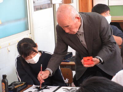 1月9日(金)、本校では習字の先生に元南関町教育長で、南関第三小学校で校長先生を務められた書道の達人である大里 耕守先生をお招きし、3年生から6年生までが「新春の書き初め」に取り組みました。今年の言葉は、3年生が「正月」、4年生が「元気」、5年生が「初春」、そして6年生が「理想」です。