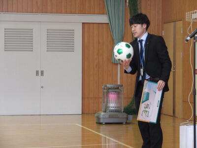 この度、明治安田生命様より、日本サッカー界のレジェンド・三浦知良選手の「カズサッカーボール」を寄贈していただきました。ピカピカの新しいボールです。この素晴らしい贈り物を手に、冬の澄んだ空気の下で、仲良く元気に校庭を駆け回ってほしいと願っています。