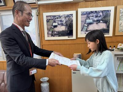 2月3日(火)、その素晴らしい作品の中から選ばれた児童の表彰式が、本校の校長室にて執り行われました。今回、4年生の受賞児童は、大原郵便局の右山局長様から直接、輝かしい表彰状を受け取りました。右山局長様から温かなお言葉をいただきました。全児童には参加賞が渡されました。