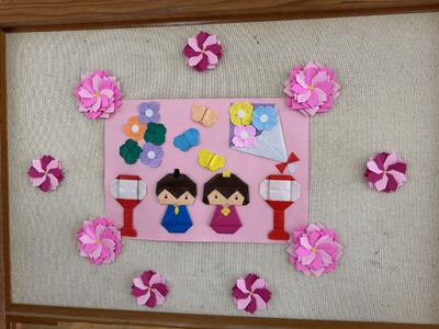 児童玄関の掲示板に用務員の松本先生がひなまつりの掲示をされました。
