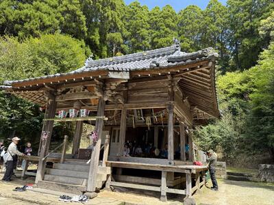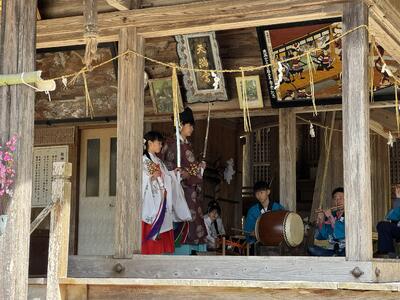 4月11日(土)、気持ちのよい晴天の下、小原天満宮で行われた祇園祭で子供が神楽を舞いました。