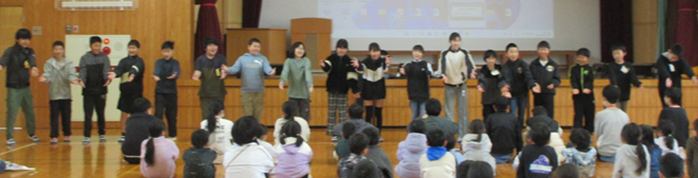 2月13日(金)に学習発表会がありました。「伝える」という目標を立て、9月から「米作り」「環境学習」「水俣病学習」の3つの班に分かれ、「劇」「ニュース」「構成詩」の3つの伝え方から選択してセリフや動きなど子供たち自身で準備を行ってきました。12分という短い発表時間の中で、1年間学んできたことをどのように伝えるか。どんな内容にするか。「伝える」ために試行錯誤を行いました。しかし、冬休みがあけた1月。歌の練習で集中できない場面が見られたり、真剣に練習できない時があったりすることもあり、1度は歌を歌わないでおこうと話し合いました。このままでは伝えたいものも伝わらないと、子供たちはもう一度「伝える」という目標に立ち返り、自主練習に励んでいきました。時には朝の時間に2回以上歌の練習を行ったこともありました。