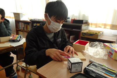 6年生は、卒業記念作品に取り掛かっています。彫刻刀で、表したいことを夢中になって彫っています。友達の名前、好きなキャラクターなどアイデア豊かです。ゆっくり丁寧に思いを込めて手を動かす6年生。自ら選んだお気に入りのオルゴールの曲が、仕上げにボックスにセットされるようになっています。ふと、誰かが教室でオルゴールのねじを回して耳を傾けるときがあり、教室が温かくなります。出来上がりが楽しみです。