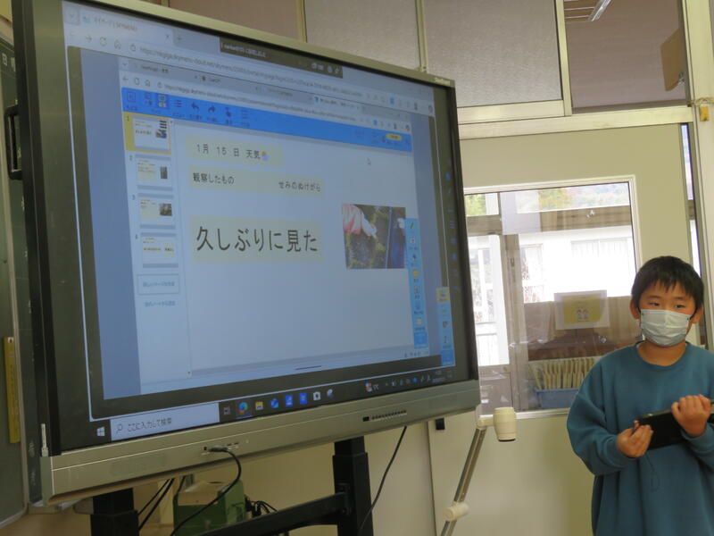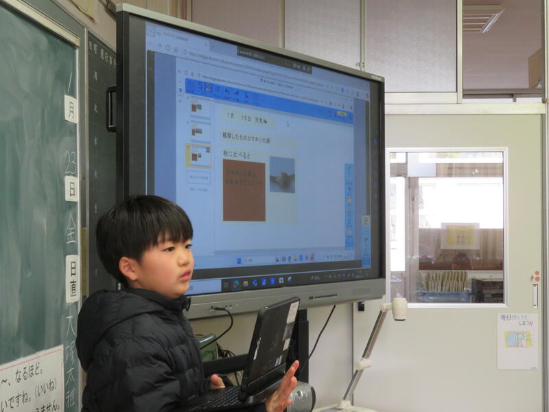 現在,総合的な学習の時間では,これまでの大豆の学習をスライドにまとめています。大豆が好きな人,苦手な人が三小にどれくらいいるのか,大豆の歴史,大豆の育て方,大豆はどんな食品にかわるのかなどの4つの班にわかれてスライドを作っています。完成したスライドは学習発表会で発表を予定しています。