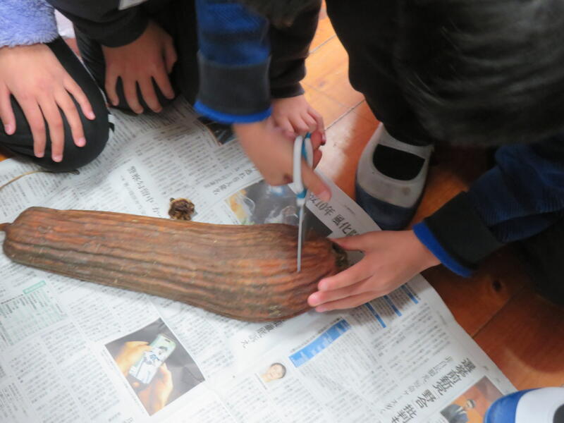 その後、タブレットでまとめ、発表をしました。さらに、ヘチマは、秋になってもまだ緑色の実をつけていましたが、ついに枯れてしまいましたので、種取りもしました。