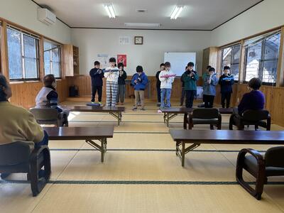 1月26日(月)にサロン二城山のみなさんと交流会を行いました。今回の交流会の目的は,日頃お世話になっている地域の方々に感謝を伝えたり,昔の暮らしについて学んだりすることでした。