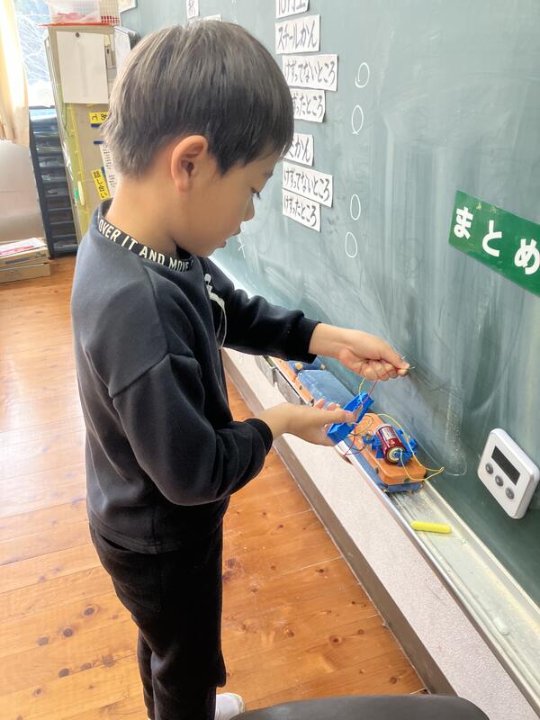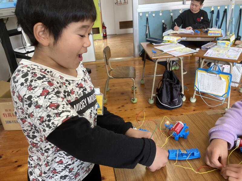 3年生の理科では、「電気の通り道」という学習をしています。乾電池と豆電球を使って、どうすれば明かりがつくかという問題をもとに、導線のつなぎ方を工夫して実験し、どんな場合に電気が通るのか考えました。とても面白いつなぎ方を考えている子もいました。