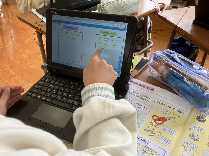 その後、回路の途中に鉄の釘とつまようじをつないだら、明かりはつくのかという新たな問題を解決するために、実験を行いました。この学習をすると、「他に電気を通す物にはどんな物があるか」という問題が出てきましたので、次の時間に、一人一人調べてみたい物を考え、実験を行いました。いろいろな物を回路の途中につなぎ、みんなとても興味深そうに取り組んでいました。そして、電気を通す物と通さない物の仲間分けをして秘密を探りました。
