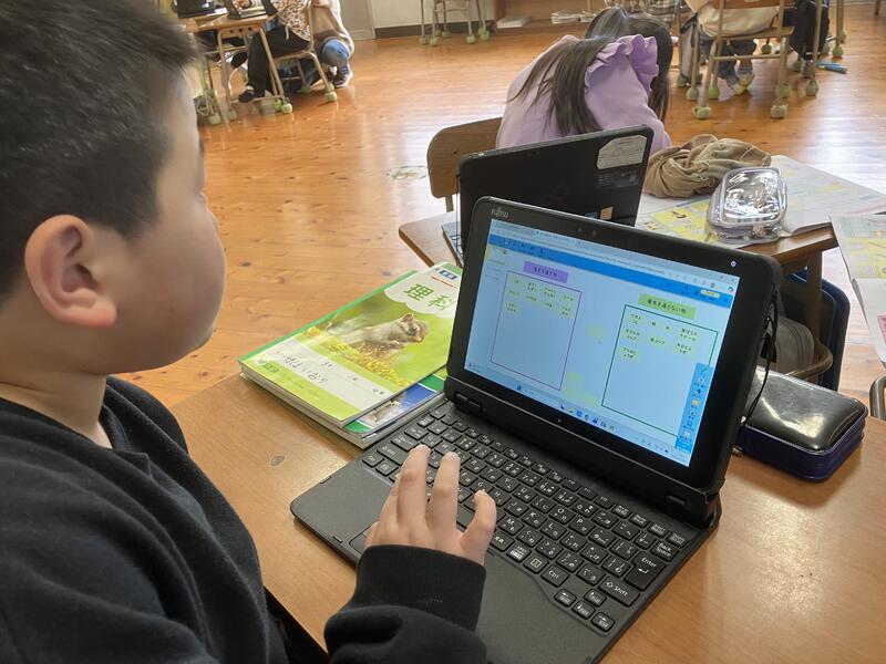 現在、国語で「詩の工夫を楽しもう」を学習しています。「頭文字をつなげて読むと言葉が出てくる。」,「声に出して読み,言葉のリズムやひびきを工夫する。」,「文字や詩全体の形を,絵のように見る。」などの詩の工夫を活用して,オリジナルの詩を作っています。子供たちは工夫をどのように活かすかわくわくしながら考えていました。写真は「回」を並べて書くと回転して見える錯覚を活かして「目が回る」という詩を書いている様子です。また,隣の児童は,頭文字を読むと「ありがとういいたい」の文章となるように学校生活の様子を詩に表しています。