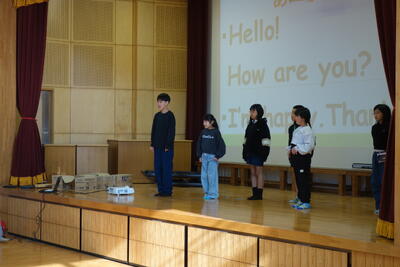 集会の始まりは、ステージに立つ企画委員の児童による元気いっぱいの英語のあいさつから!「Hello song」や「Week song」では、ジェスチャーを交えながら、全員が一体となって楽しく歌い、一体感に包まれました。