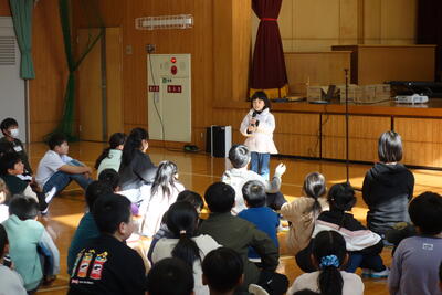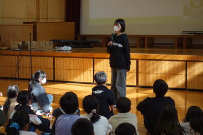 「本は両手で持とうね」「図書室では落ち着いて本を読もう」 そんなやさしい言葉に、全校の子どもたちも集中して耳を傾けていました。 発表を聞く表情からは、「本を大切にしよう」「図書室をきれいに使おう」という気持ちが伝わってきました。