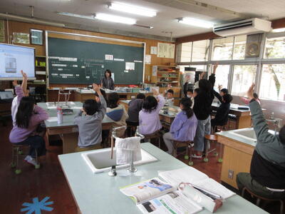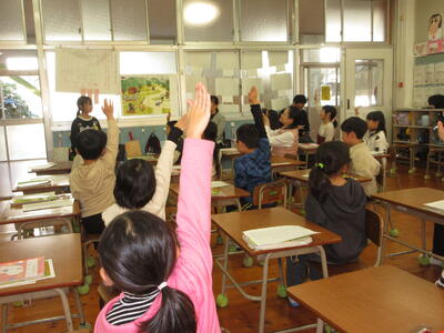 さらに「3 hints quiz」です。英語で出されるヒントをもとに答えを考える活動に、子供たちは真剣な表情で取り組みました。次々に手を挙げる姿からは、南関三小っ子の「考える力」がしっかりと育っていることが伺えました。