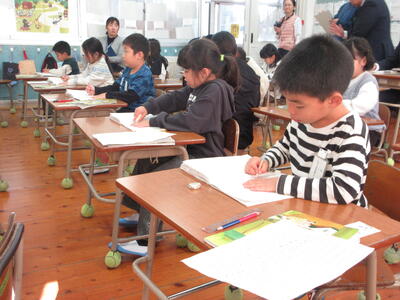 ゆっくり、しっかり、気持ちをこめて、先生の声かけに励まされながら、子供たちは集中して取り組み、自分の文字と向き合う時間を大切にしていました。正しい姿勢でていねいにこれからも取り組んでほしいと思います。