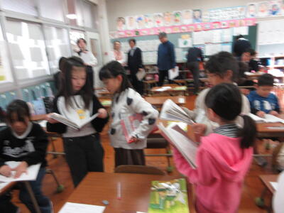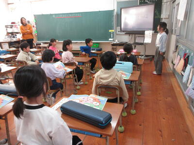 4年生は『Brown Bear, Brown Bear, What do you see?』。 くり返しのフレーズが心地よく、聞いているうちに自然と口ずさむ子も。 色や動物の名前が英語で出てくるたびに、「知ってる!」と嬉しそうな声があがりました。