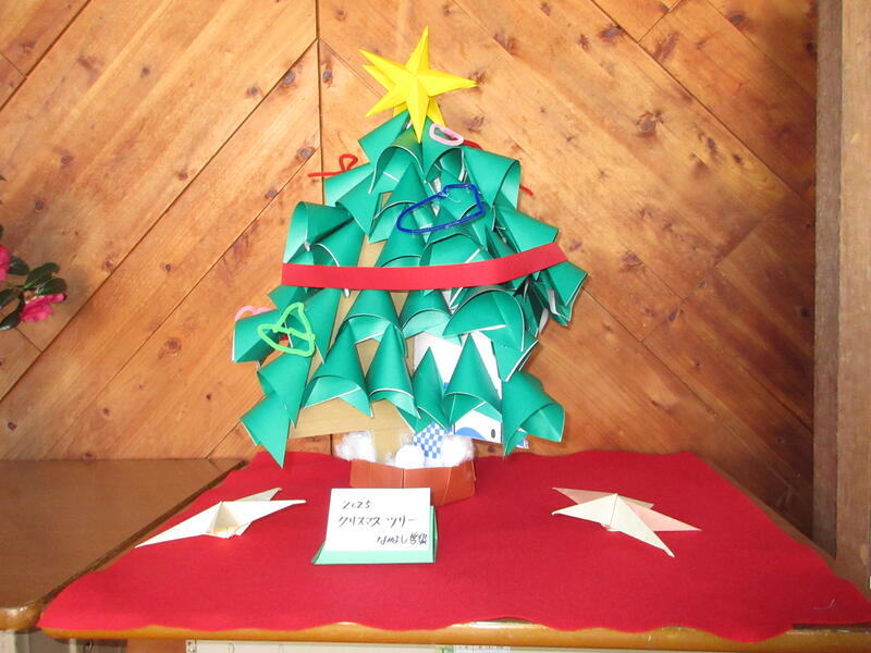 12月19日(金)、学校の正面玄関に一足早く、クリスマスのあたたかな雰囲気が届きました。昇降口の「なかよしギャラリー」に、なかよし学級の子供たちが心を込めて作った、すてきなクリスマスツリーが登場しました。
