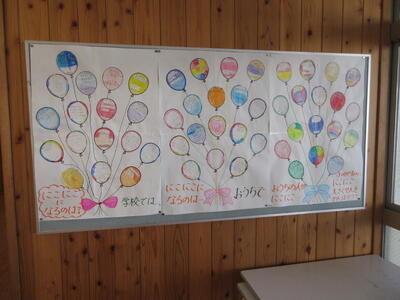 1年生の廊下の掲示です。「にこにこになるのは」を考えました。おうちやがっこうなどで。みんなにウェルビーイングが循環するといいですね。