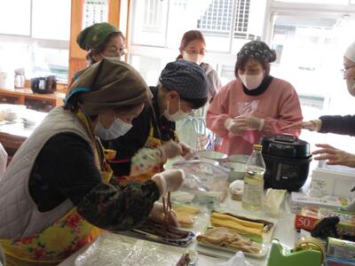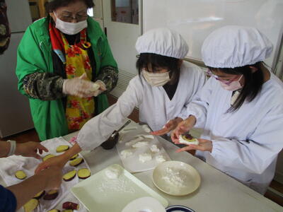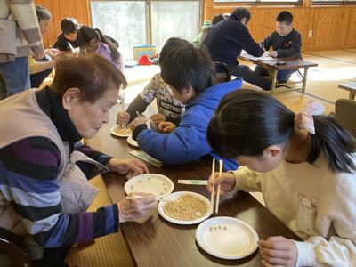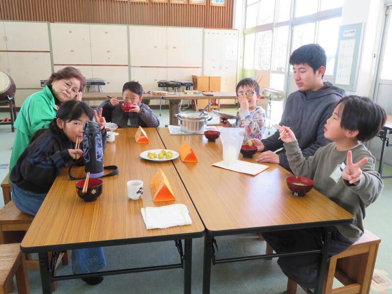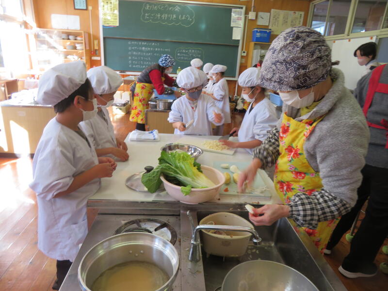 午前中には、婦人会の皆様にご協力いただきながら、お料理作りに挑戦しました。メニューは、心までポカポカ温まる「だんご汁」と、お口に広がる甘みが嬉しい「いもきんとん」。初めて包丁を握る手つきにドキドキする場面もありましたが、地域の皆様の優しく丁寧なサポートのおかげで、子供たちは安心して野菜を切ることができました。お出汁のいい香りが教室いっぱいに広がる中、瞳を輝かせる子供たち。一生懸命にだんごを丸め、みんなで協力して作り上げた一品には、手作りならではの大きな達成感が詰まっていました。