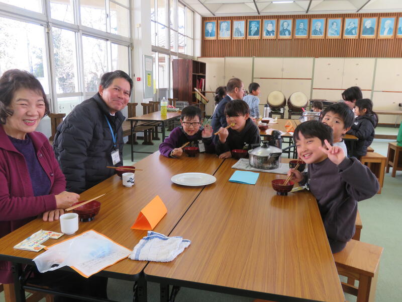 午後からは、生活科の学習で野菜作りを教えてくださった福山正英先生、そして町探検で温かく迎えてくださった郵便局、交流センター、おざきパン工房、しずく屋、白うさぎの皆様をお迎えし、感謝の集いを行いました。「いつもありがとうございます」の気持ちを込めた感謝状とメダルの贈呈、そして自分たちで育てた野菜の甘みがたっぷり溶け込んだだんご汁の試食。一緒に机を囲み、美味しさを分かち合うひとときには、三小ならではの穏やかで幸せな時間が流れていました。