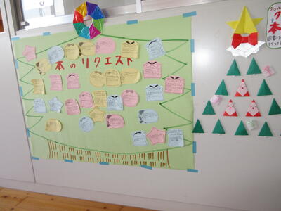 企画委員会では、先日行われた縦割り班遊びについて、子供たちの感想や「次にやってみたい遊び」を募集しました。  玄関に設置した意見箱には、たくさんの声が寄せられ、全校での遊びを楽しんだ気持ちや、次への期待がたっぷり詰まっていました。