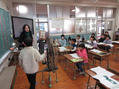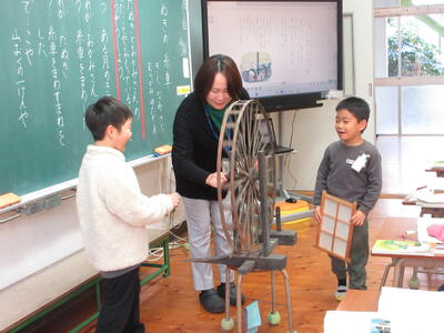 国語の学習で『たぬきの糸車』を読み、登場人物の気持ちを読み取る学習を行いました。  「ぼくも糸車まわしてみたいな」というたぬきのつぶやきに、「かわいいね」「気持ちがわかる」と共感が広がる一方で、  おかみさんのやさしさや思いやりにも目を向け、たぬきとおかみさん、どちらの気持ちにも寄り添う学びとなりました。