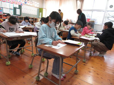 ゆっくり、しっかり、気持ちをこめて、先生の声かけに励まされながら、子供たちは集中して取り組み、自分の文字と向き合う時間を大切にしていました。正しい姿勢でていねいにこれからも取り組んでほしいと思います。