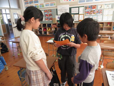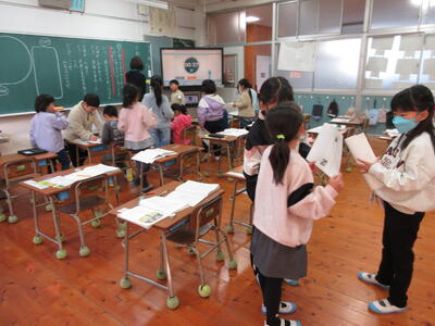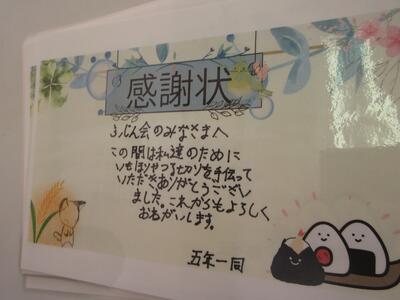 また、5年生はお世話になった方々へ、手づくりの感謝状をお渡ししました。 一人ひとりが言葉を選び、丁寧に書いたメッセージには、素直な思いと感謝の心があふれており、受け取った方々の笑顔がとても印象的でした。