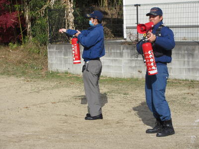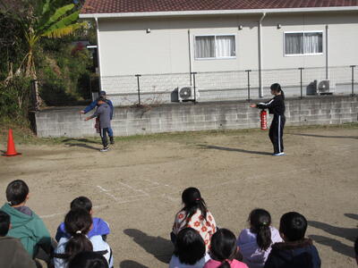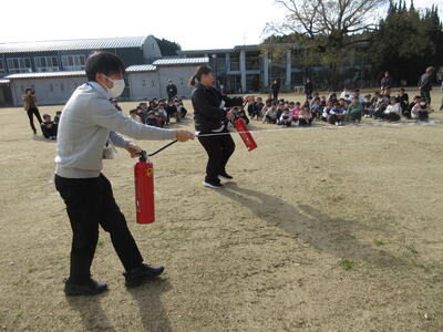また、教職員も消火器の使い方を再確認しました。松山先生と右田先生が代表して訓練に参加し、落ち着いた動作で模範を示してくださいました。 子供たちはその様子を静かに見守りながら、防災への意識をさらに高めていました。