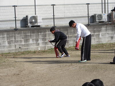 火災避難訓練のあと、6年生の代表4名が水が出る訓練用消火器を使った消火訓練に挑戦しました。 コーンを火元に見立て、落ち着いて消火器を構え、手順を一つひとつ丁寧に確認しながら水を噴射しました。 真剣な表情で取り組む姿はとても頼もしく、下級生にとってもよいお手本となる姿でした。