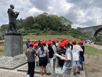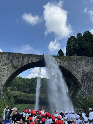 続いて向かった通潤橋では、ガイドの方の話に真剣に耳を傾けました。 広い敷地内での移動の際には、互いの歩調を合わせ、場所を譲り合うなど、仲間を気遣う「協力する力」が自然と発揮されていました。