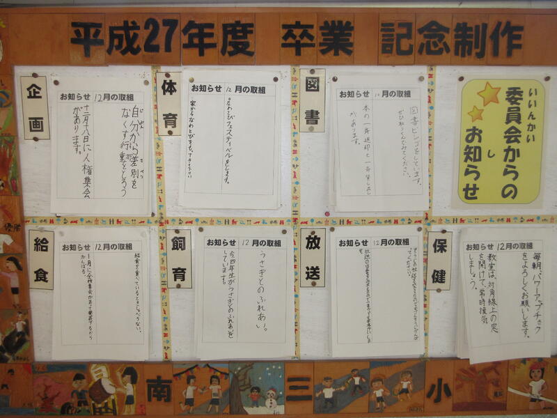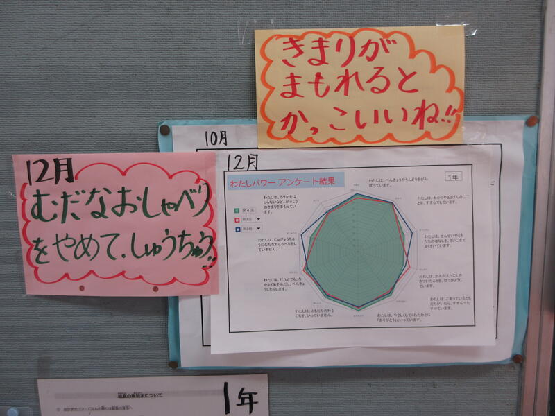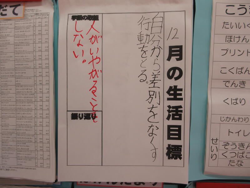 12月の生活目標は、 「自分から差別をなくす行動をとる」。1年生では、 学級の取組として「人がいやがることをしない」 を決めています。