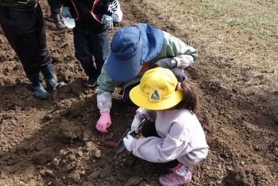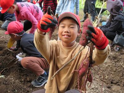 前半は土が硬く、なかなか掘り出せない場面もありましたが、子どもたちはスコップや手を使って根気強く掘り進め、次々と立派なサツマイモを収穫していきました。 土の中から現れるサツマイモに目を輝かせる姿、友だちと顔を見合わせて笑い合う姿――畑にはたくさんの笑顔が広がっていました。