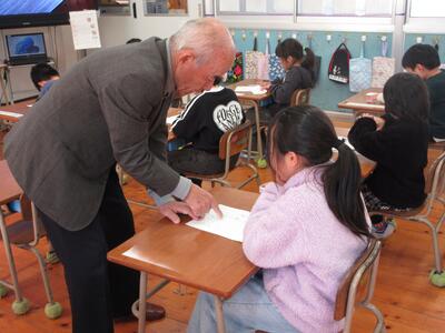 12月11日(木)、2年生は、書道家の大里耕守先生をお迎えし、硬筆のご指導をいただきました。 子供たちは、鉛筆の持ち方や姿勢に気をつけながら、一文字一文字をていねいに書くことの大切さを学びました。