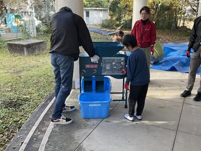 その後、学校で育ててきた大豆を11月20日に収穫し、天日干しを行いました。11月27日には、丸美屋さんと一緒に大豆の選別と豆腐づくりを体験しました。昔ながらの道具「めぐり棒」や「とうみ」を使っての作業は初めてでしたが、友達と声をかけ合いながら取り組む中で、協力する力が育まれていきました。