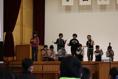 4年生は、国語科で学習した「ごんぎつね」を、歌とリコーダーを交えた音楽劇で発表しました。子どもたちは登場人物の心情を深く汲み取り、一つひとつの台詞や音色に心を込めて表現しました。