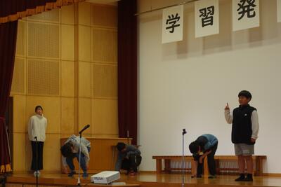 総合的な学習の時間を中心に平和の尊さについて学び考えたことを修学旅行で講話いただいた語り部の方からの平和のバトンの意味をしっかり考えて、仲間と協力して取り組んだ劇を披露しました。原爆が投下された11時2分で止まった時計から、11時3分という未来を奪われた被爆者の思いや、平和な社会の日常への感謝の気持ちを伝え、参観者に感動を与えてくれました。