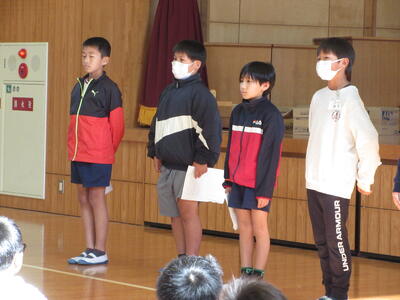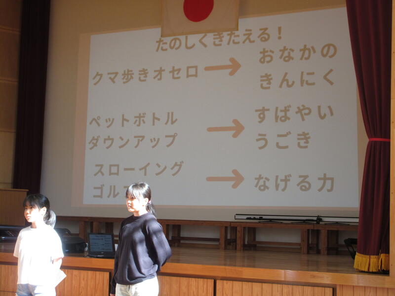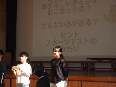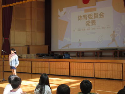 12月1日(月)、児童集会で体育委員会の取組について発表が行われました。「運動が好きな人も、ちょっぴり苦手な人も、みんなが楽しめる運動をめざして」。 誰もが笑顔で体を動かせるように、どんな工夫をしているのかを、わかりやすく、あたたかい言葉で伝えてくれました。