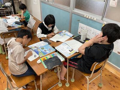 本日の理科は,「自然の中の水のすがた」を行いました。前回設置した2つのビーカーがどのように変化したかを観察し,結果をまとめ,考察を考えました。タブレットを使用し,絵や図を用いながら考察を考えていました。子どもたちは,「水は目に見えない小さなつぶになって空気中に出て行った。」と結論づけていました。