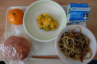 本日は、和風スパゲティ、コロコロサラダ、みかん、丸パン、牛乳でした。