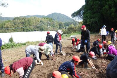 10月31日、秋晴れの空の下、児童が笑顔いっぱいで芋掘りに挑戦しました。 春に植えた苗がぐんぐん育ち、土の中には立派なサツマイモがぎっしり。 歓声を上げながら、スコップで掘っては手で掘って、夢中になって収穫する姿がとても印象的でした。