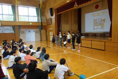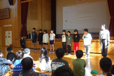 12月1日(月)、児童集会で体育委員会の取組について発表が行われました。「運動が好きな人も、ちょっぴり苦手な人も、みんなが楽しめる運動をめざして」。 誰もが笑顔で体を動かせるように、どんな工夫をしているのかを、わかりやすく、あたたかい言葉で伝えてくれました。