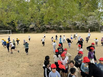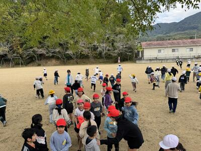 昼休みの校庭に、にぎやかな笑い声が響きました。 企画委員会の児童が計画・進行を担当した「たてわり班による鬼ごっこ」が、全校児童で楽しく行われました。