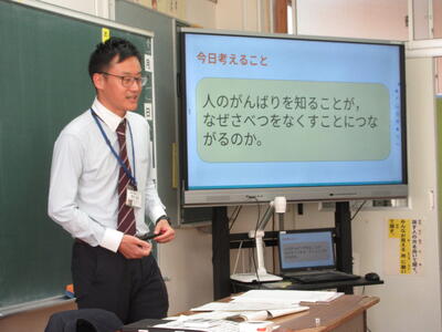 11月7日(金)、3年生担任の田川 昭太先生が、南関第三小学校代表で南関町の人権学習公開授業を行いました。南関町の各学校からたくさんの参観者がありました。