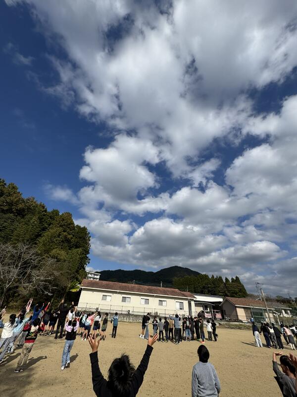 運動場いっぱいに広がる笑顔と歓声。 その様子は、まるで空に向かって「こんにちは!」と学校全体があいさつしているようでした。