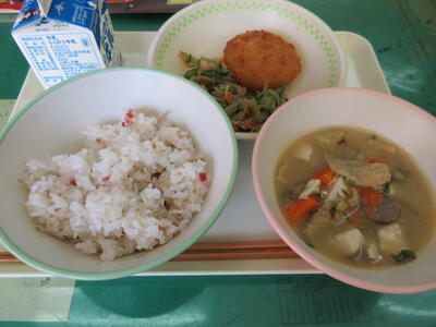 今日は、大正12年の給食の再現メニューでした。大正12年は、関東大震災が起こり、食べるものがなく栄養がとれない子供が増えました。給食に使う食べ物も少なかったので、五色ごはんと栄養みそ汁だったそうです。2品と少ないですが、少しでも栄養がとれるようにご飯の中にも野菜が色々入っていたり、みそ汁も具もたくさんの種類の野菜が入っていたそうです。